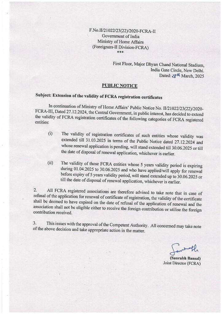 - Such organisations can continue to receive and use foreign contributions until 30th June 2025 or until their renewal is decided, whichever is earlier.