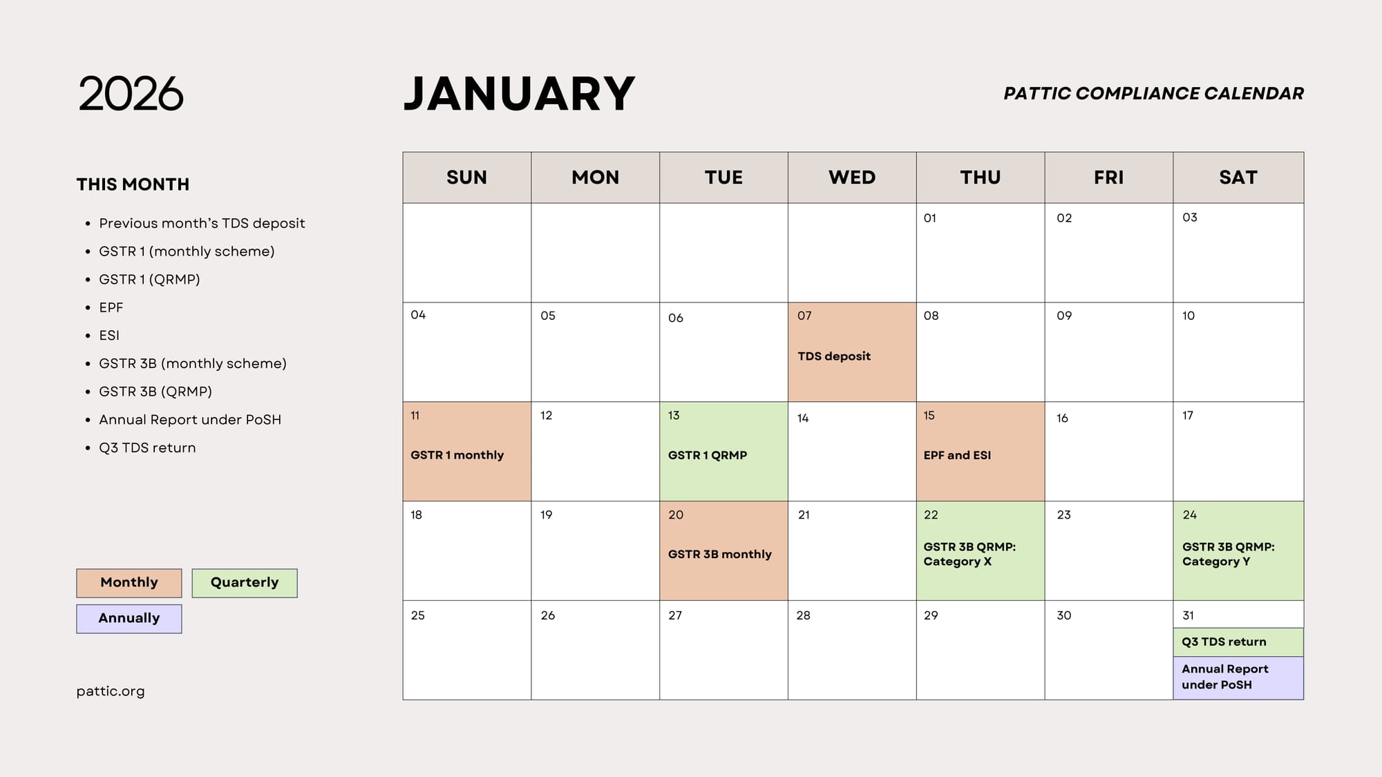 January is a good month to set a calm, steady compliance rhythm for the year. Here’s PATTIC’s quick compliance calendar for January 2026.