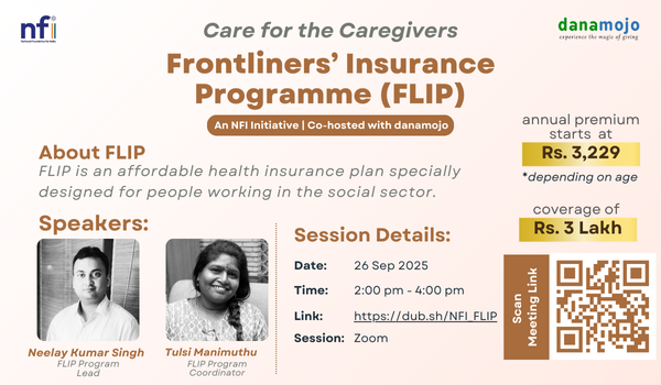 To address this gap, the National Foundation for India (NFI) has launched the Frontliners' Insurance Program (FLIP). Danamojo is co-hosting a session with NFI to help NPOs learn more about this initiative.